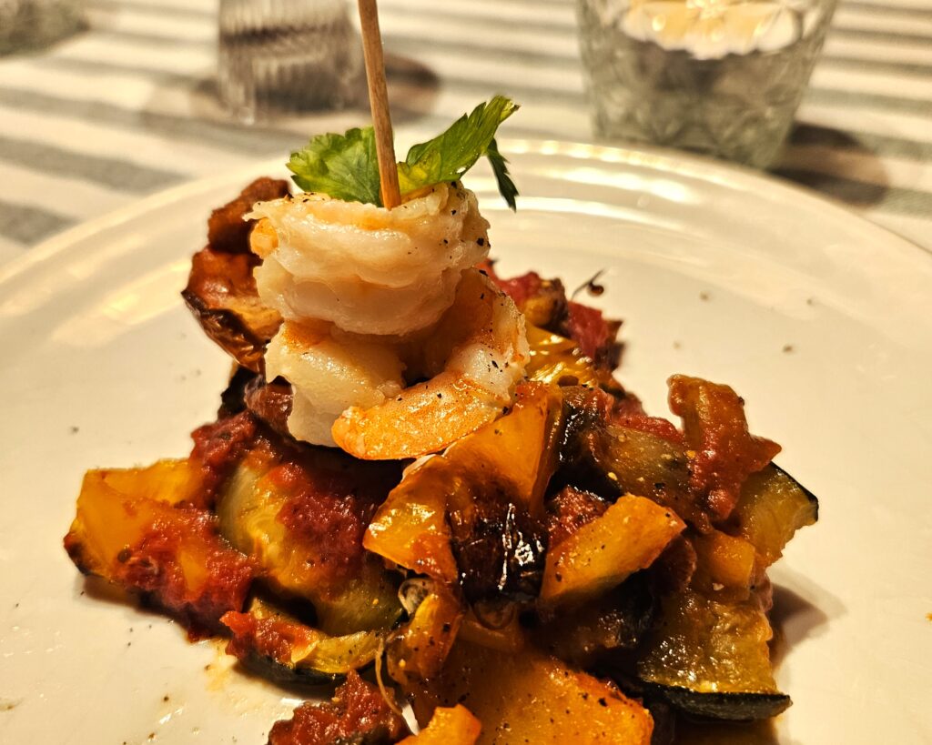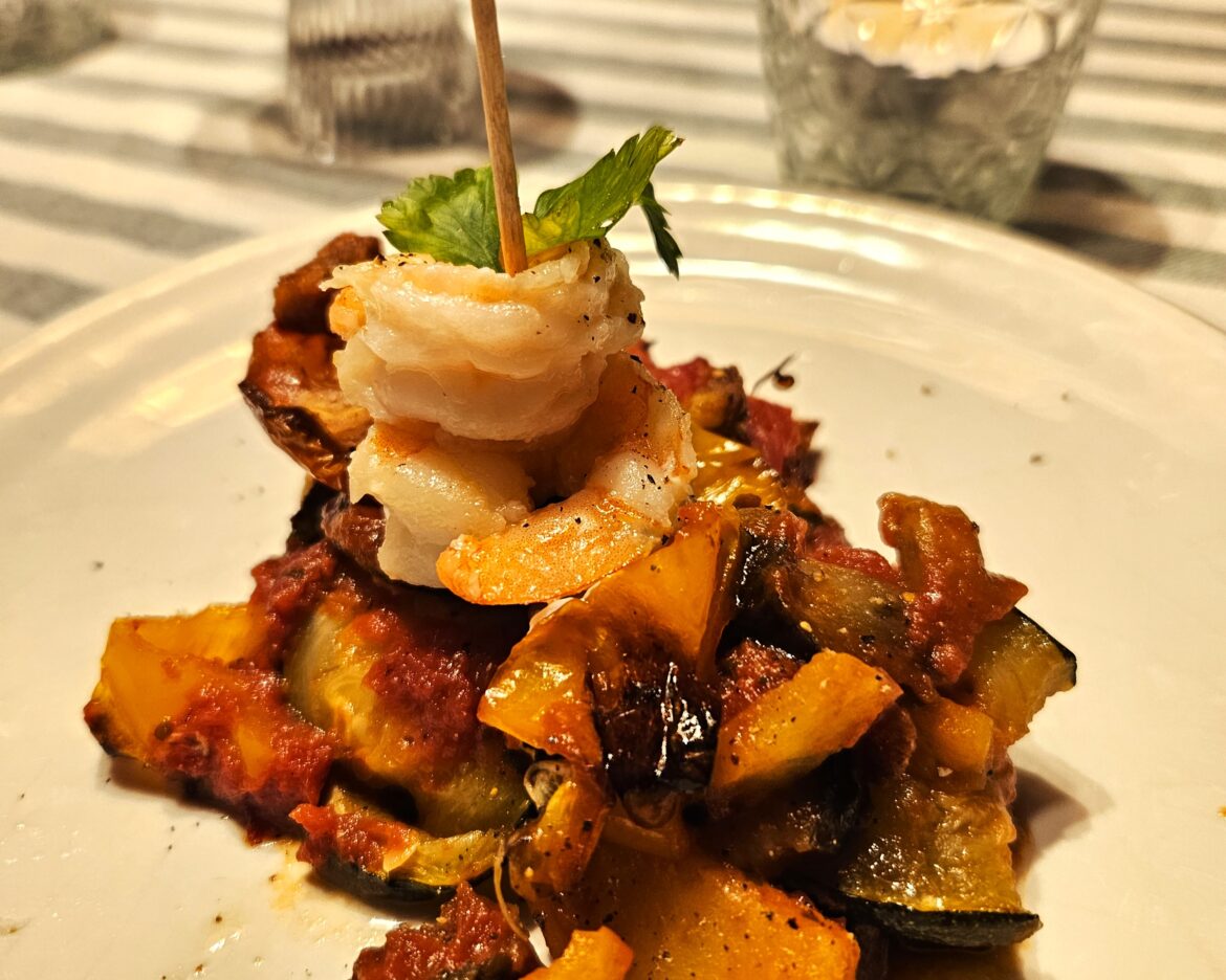 Tumbet mallorquin vereint mediterranes Gemüse – in würziger Tomatensoße im Ofen geschmort – auf köstliche Art. In meiner Interpretation kommen als Crunch on top noch in Olivenöl gebratene Croutons mit Thymian & Rosmarin dazu. Ein optionaler kleiner Hühnchen- oder Garnelenspieß, etwas Brot und Wein machen für mich das Gericht perfekt!