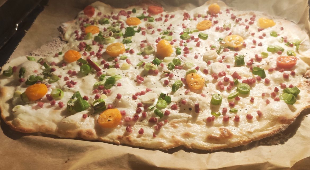 … hauchdünner, knuspriger Teig in Kombination mit Schmand, Schinkenwürfeln und Frühlingszwiebeln – Flamkuchen! Mit diesem Rezept gelingt er garantiert auch glutenfrei.