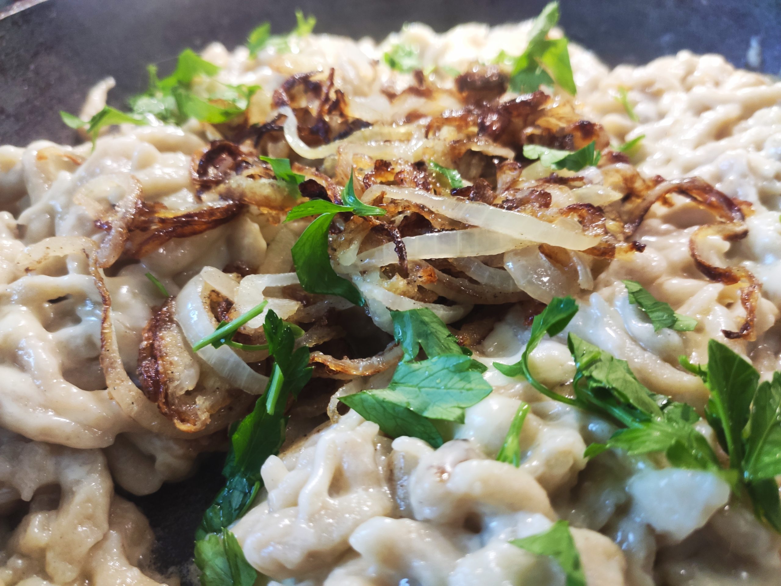 Für Käsespätzle: die gebutterten Spätzle mit vorher angebratenen, karamellisierten Zwiebelringen (vor dem Braten kurz mehlieren und mit Pr.Salz/Zucker in die Pfanne geben und bräunen) in eine Auflaufform geben und im Ofen mit mittelkräftigem Käse einige Minuten überbacken lassen (alternativ ist auch ein milchfreier Käseersatz möglich, schmeckt dann aber sehr mild). Zum Servieren mit Petersilie bestreuen und einen grünen Salat mit säuerlicher Vinaigrette reichen.